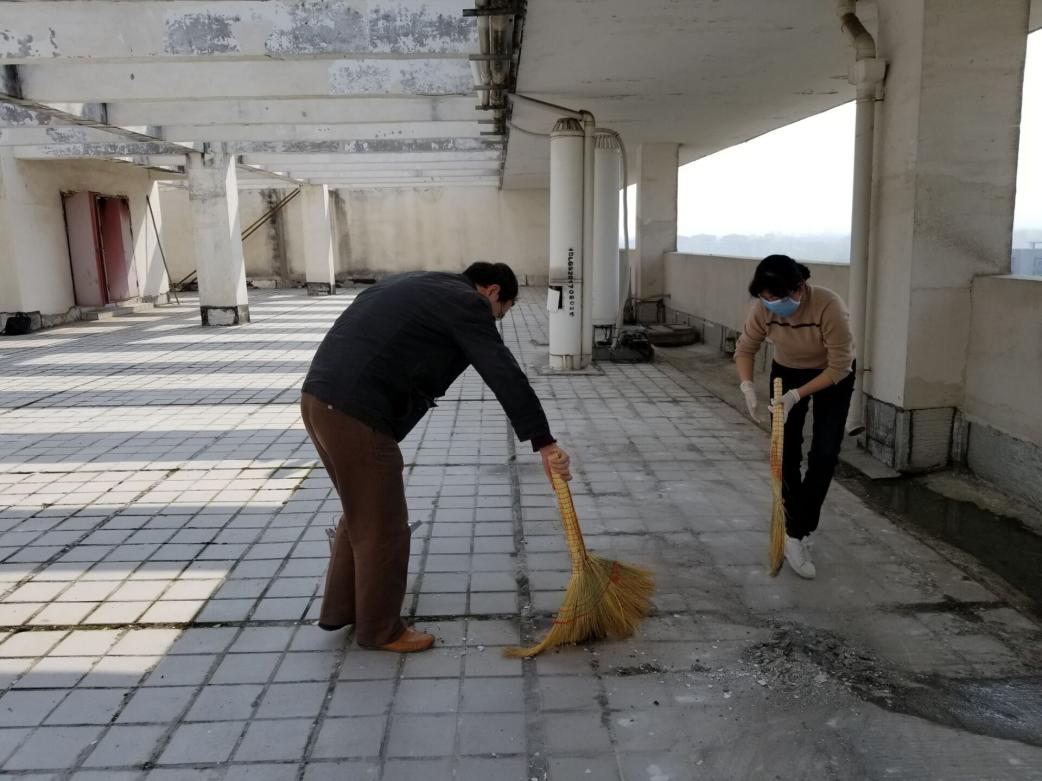 图3 刘永双、冯飞两位老师正在打扫1号教学楼楼顶