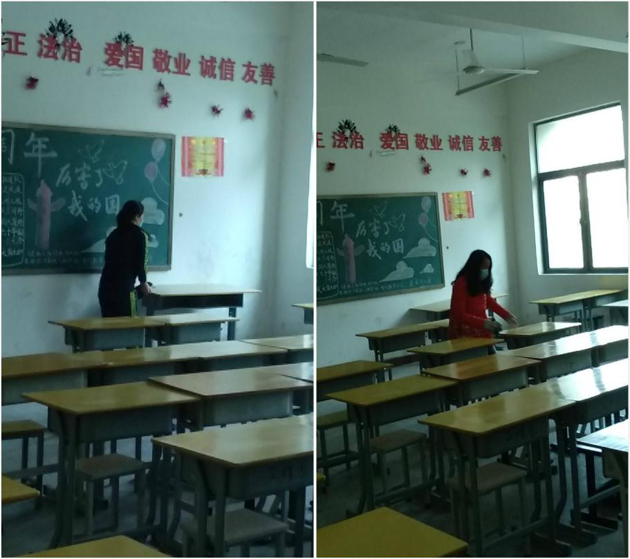 图1 孙莉院长和江微微老师正在将教室桌椅摆放整齐,擦洗干净