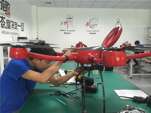 ↑科比特工业无人机车间内,技术人员正在测试无人机。本报记者杨阳腾摄