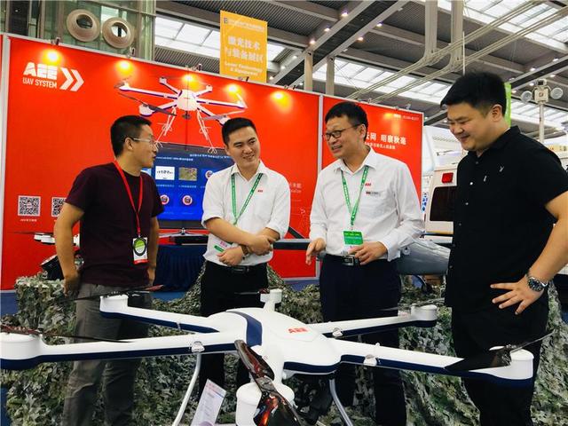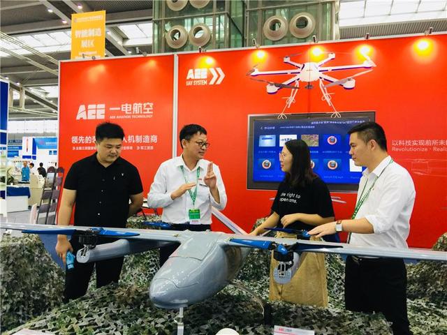 ↑2018宝安产业发展博览会上,深圳一电航空技术有限公司行销总监张志飞(右二)介绍自主研发的无人机产品。