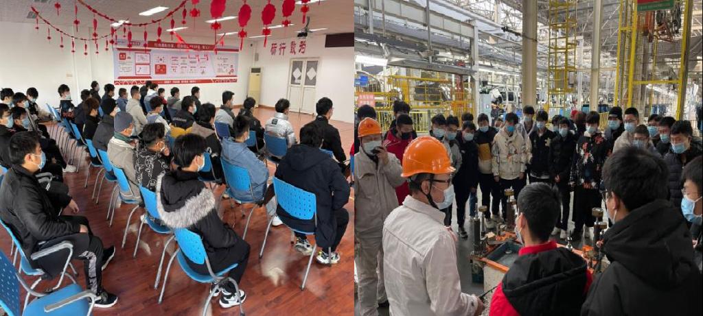在东风日产襄阳工厂,设备保全科王系长向学生们介绍东风日产“奋斗获取幸福”的工匠精神,带学生们参观了全自动化总装车间,了解了东风日产设备保全岗位的能力要求、素质要求及日常工作。