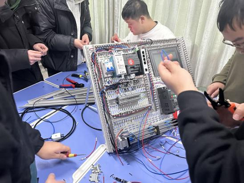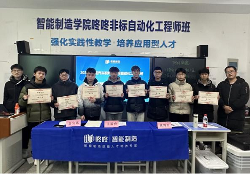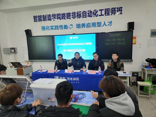 1月5日下午两点,在1号教学楼105教室,智能制造学院联合企业对非标自动化工程师班进行课程结业考试,考查学生在电气装调项目方面的理论水平和实操技能。首先,学院张书记对学生提出几点要求:一是要认真对待课程结业考试,尽最大努力展现自己这一学期的学习成果;二是遵守结业考试规则,保证考试的公平公正。最后,由校企教师担任本次结业比赛的裁判,并发布结业考试题目。