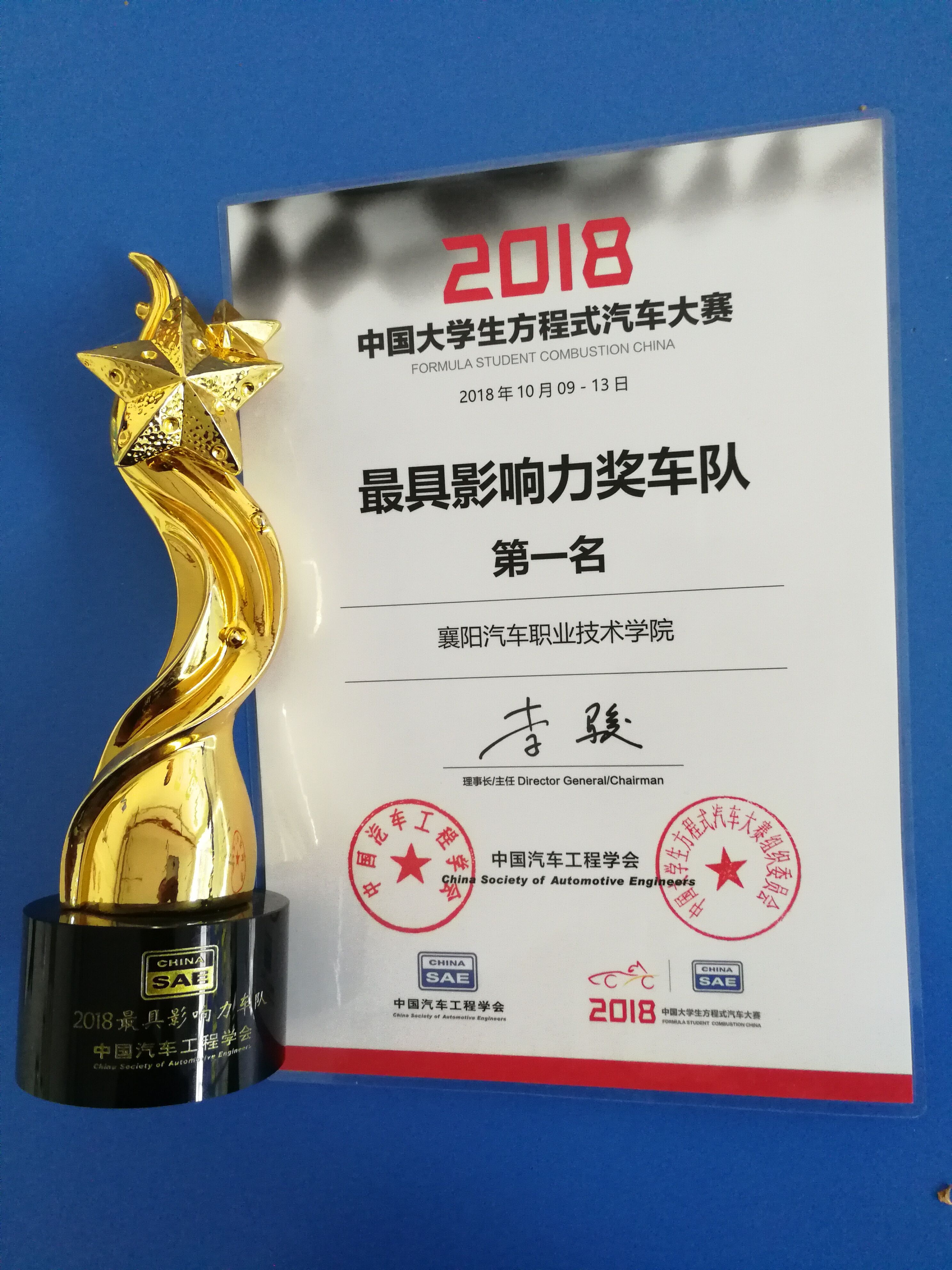 为期5天的中国大学生方程式汽车大赛于10月13日在襄阳梦想赛车场正式结束。此次共有66支来自全国各地的车队参加,人数多达3000人。在此届赛事中襄阳汽院梦启车队取得前所未有的骄人成绩。其中,八字绕环第22名,高速避障第23名,耐久测试第7名,总分655分,总排名16名,并荣获“最具影响力”车队第一名。