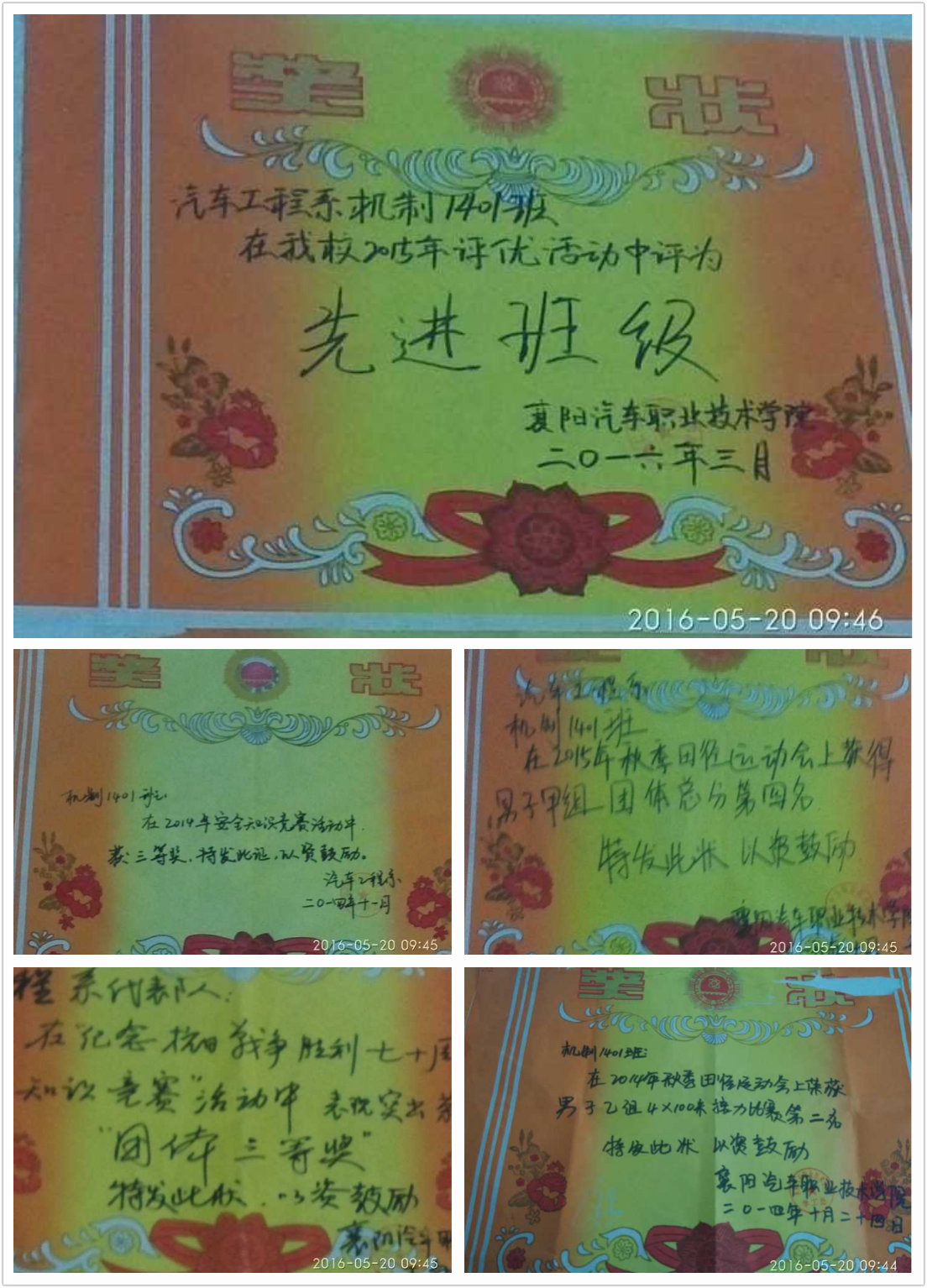 机械制造与自动化1401班积极开展专业拓展及各种社团活动,班级文化建设有特色,有创意。班上每位同学都能积极参加各种活动,2014年汽车工程系举办的安全知识竞赛活动中,荣获得三等奖。2014年学院举办的秋季运动会中,机制1401班的运动健儿在4乘100米中获得第二名的好成绩;2015年班上四名同学自告奋勇代表系部参加学院举办的纪念抗日战争胜利七十周年知识竞赛活动中,取得团体三等奖的好成绩。2015年秋季运动会中,李林同学荣获1500米和3000米两项赛事一等奖,班级获得全院男子甲组团体总分第四名。2015年在系部举办的汽车知识竞赛中,在全班同学的努力下,取得全系第二名的好成绩;2016年朱亮和刘杰两位同学参加了学院的FSC车队,经过日以继夜的紧张训练与刻苦学习,他们终于竞选上正式队员,将迎接参加2016中国大学FSC汽车大赛。
