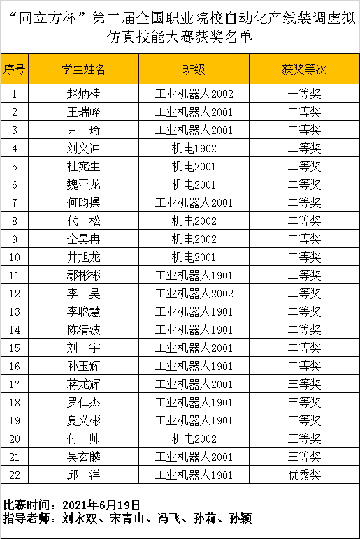 6月19日,“同立方杯”第二届全国职业院校自动化产线装调虚拟仿真技能大赛顺利开赛,全国共有1960名学生参赛。智能制造学院22名学生参赛比赛,取得了大满贯的好成绩,其中赵炳桂同学凭借扎实的专业知识和稳定的发挥获得全国高职组一等奖。