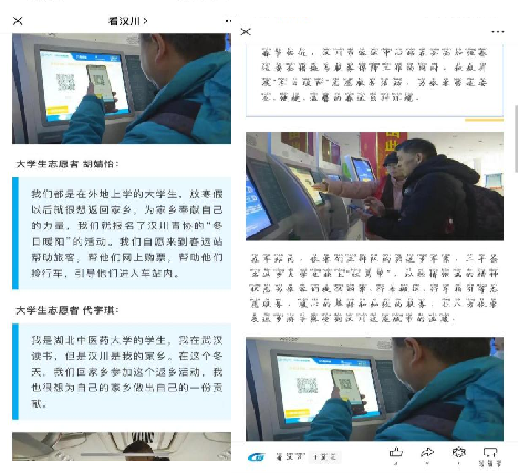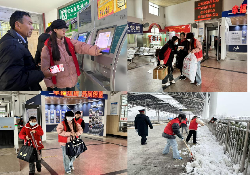 电梯2301班胡靖怡:2024年1月29日至2024年2月18日她前往汉川客运站参加“暖冬行动”志愿服务,工作内容包括车票协助购买,进站引导,帮扶老弱病残拎行李,候车区的秩序以及暴雪过后地铲雪等一系列志愿服务并被当地媒体报道,她以“奉献、友爱、互助、进步”的志愿服务精神,从细微处入手,用积极的行动和真情去温暖旅客,使每一位旅客能带着温暖愉快的心情踏上回家的路途,在志愿岗位上体现价值,在奉献中赢得赞许,为运工作增添更多动力与活力。