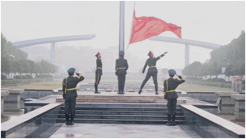 仪式伊始,在全体师生的注目下,英姿飒爽的国旗护卫队迈着整齐有力的步伐护送国旗入场。随着激昂雄壮的国歌声响起,五星红旗冉冉升起,迎风飘扬在校园上空。师生们庄严肃立,行注目礼,心中满是对祖国的热爱与敬意。