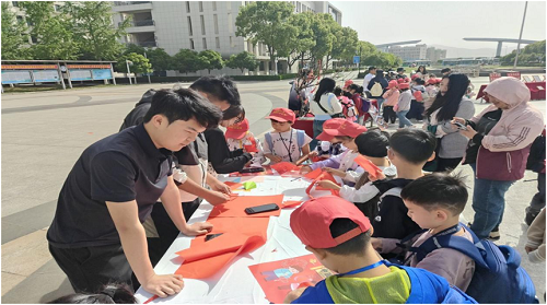 校园广场上,特色展位成为知识与文化的汇聚地。无人机展位摆放着模型,志愿者讲解其原理和应用,让小记者们对航空科技产生浓厚兴趣。漆扇、掐丝珐琅展位上,小记者们被精美的传统工艺品深深吸引。剪纸体验区前,小记者们在志愿者们的指导下尝试剪纸体验,深刻体会到传统文化在生活中的传承与延续。