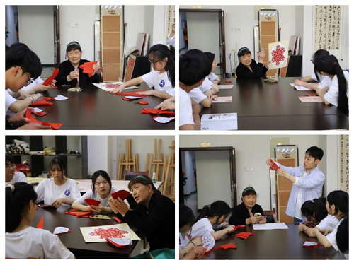 在文化馆体验区,省级非遗传承人李秀玲现场演示剪纸技法,以行云流水的剪裁技艺将红纸化为灵动图案。学院社会实践队同学在指导下尝试创作,通过一折一剪感受非遗匠心魅力。