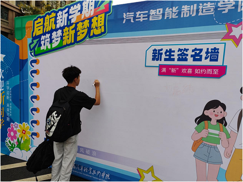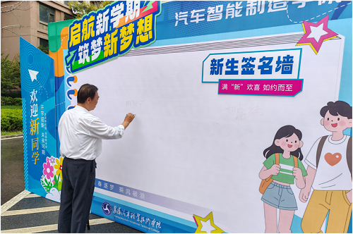 随后,祖孙二人与学院领导在签名墙前并肩合影。镜头里,新名字与老名字相邻,青年朝气与党员初心相映。这不仅是迎新季的温馨画面,更是一场跨越代际的精神接力:青年学子以专业为起点追逐梦想,老党员以四十年信仰为榜样传递力量,让“奋斗”与“坚守”的精神,在汽车智能制造学院的迎新现场,成为新生们最生动的“开学第一课”。
