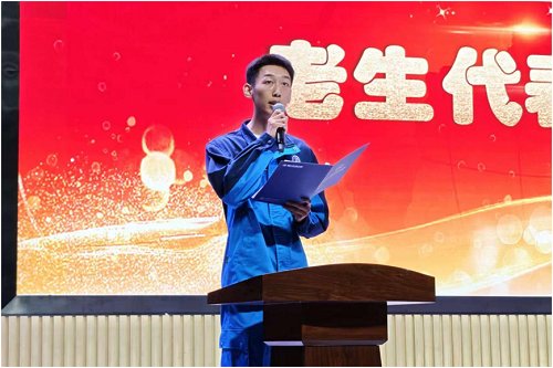 老生代表杨振宇结合技能大赛备赛经历与实习实践感悟分享成长故事,从智能产线调试到新能源汽车检测,用“实训车间里的千次打磨”诠释工匠精神;新生代表孙佳学则以“初识智能制造”为题,表达对掌握核心技能、投身新质生产力发展的憧憬,两代学子的心声共鸣,展现“技能宝贵、创造伟大”的青春共识。