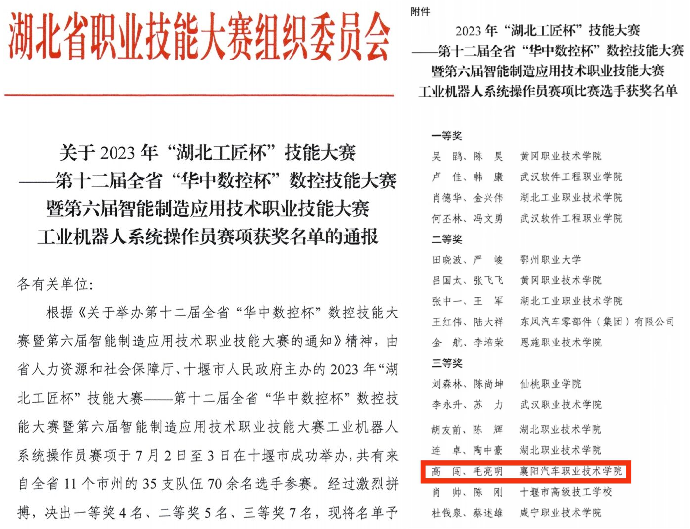 7月2日至5日,由湖北省人社厅、十堰市人民政府主办的2023年“湖北工匠杯”技能大赛——工业机器人系统操作员赛项在十堰举行,共有来自全省11个市州的35支队伍70余名选手参赛。由我校智能制造学院武锐、黄闪闪老师指导的工业机器人2102班学生高闯、毛亮明,经过理论考核和实操考核两轮比拼,荣获大赛三等奖。