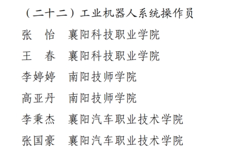 智能制造学院为贯彻落实习近平总书记关于技能人才工作的重要指示精神和省委省政府深入实施“技兴荆楚”工程的部署要求,积极鼓励并推动学生参与各级各类技能大赛。我校工业机器人技术专业2201班张国豪、李秉杰在中国(襄阳)第四届汉江流域职业技能大赛暨第二届襄十随神职业技能大赛工业机器人系统操作员赛项中荣获二等奖,并受到襄阳市政府1万元现金奖励。