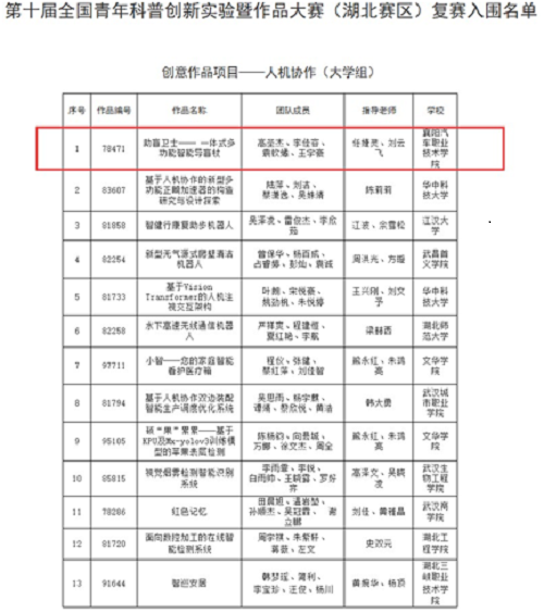 近日,由湖北省科学技术协会、共青团湖北省委共同主办的第十届全国青年科普创新实验暨作品大赛湖北赛区复赛入围名单公布,我校智能制造学院任婕灵,刘云飞老师指导的“助盲卫士── 一体式多功能智能导盲杖”项目成功入围复赛,位列大学组第一。