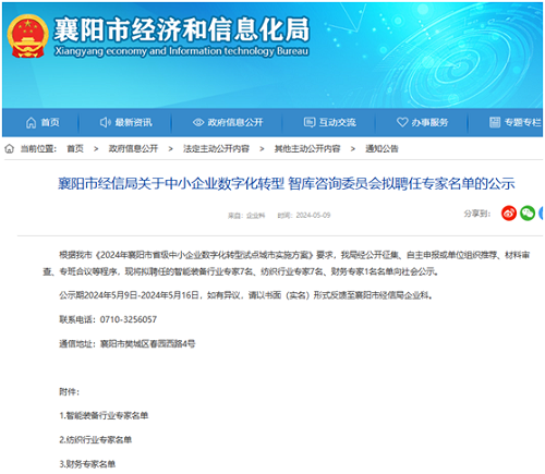 据悉,全市智能装备行业入库该项专家仅7人,今年5月起,将在襄阳市市经信局的组织领导下,将对市域相关中小企业数字化转型开展专项评审和业务指导。