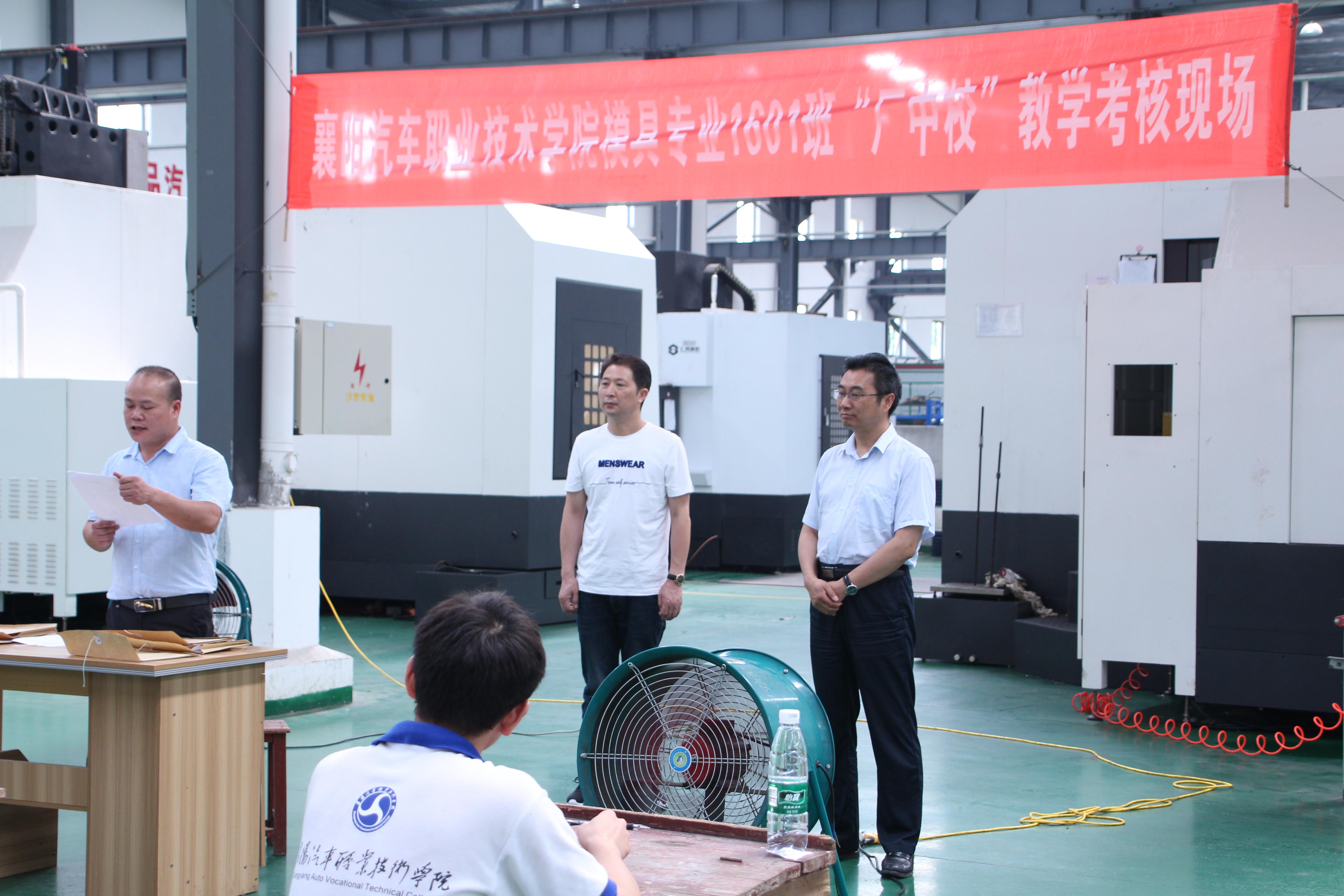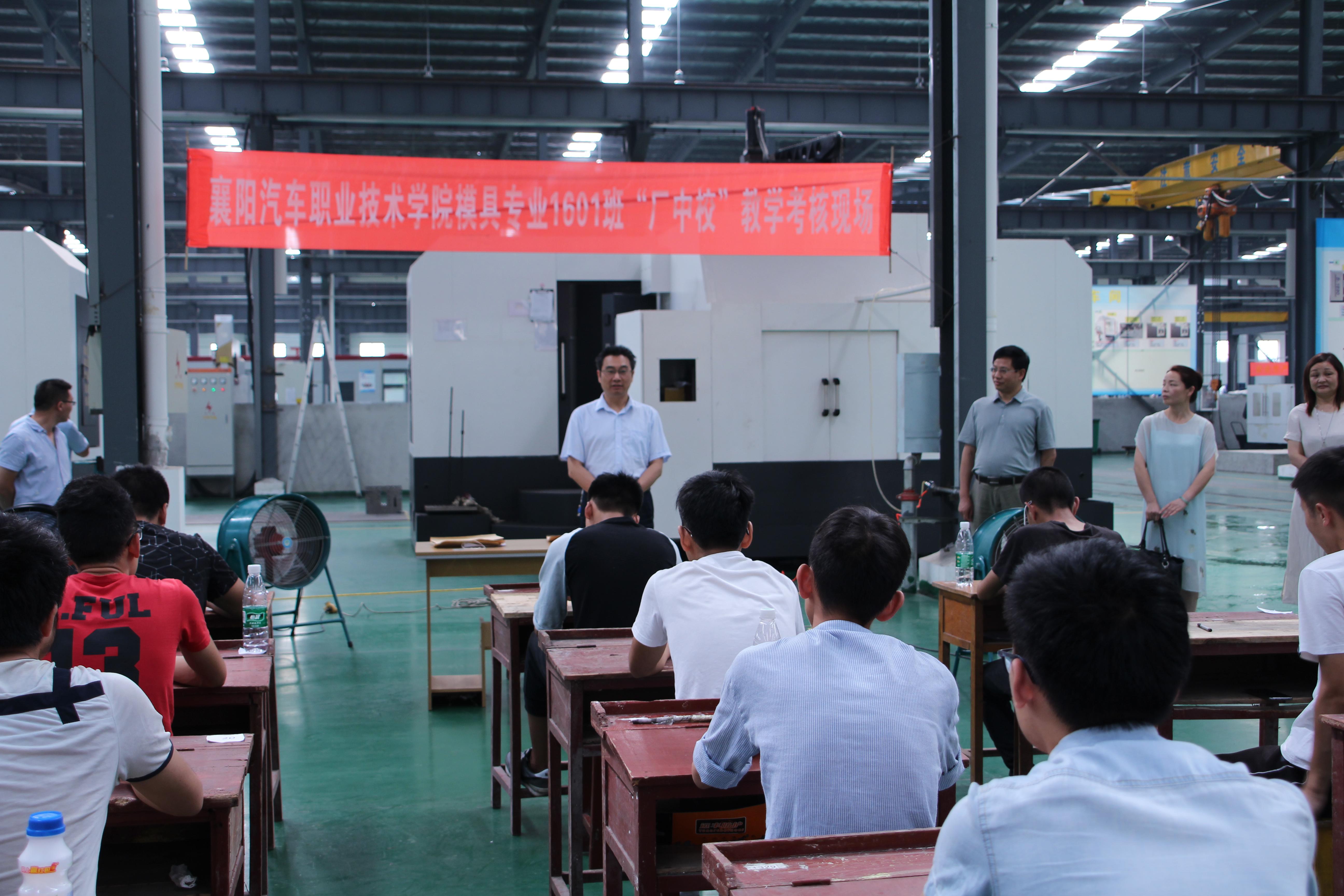 (通讯员:孙莉)6月15日,汽车工程系模具专业36名大二学生完成本学期“厂中校”的学习,在湖北精金模具公司生产车间里,接受襄阳汽车职院、枣阳市教育局、湖北精金模具校、政、企三方的联合考核。莅临考核现场的有学院党委书记许云、副院长管用才、院领导熊良猛,枣阳市教育局长苏洪明、副局长曹中强,湖北精金模具科技有限公司总经理陈登奎,参与考核工作的还有学院汽车工程系主任孙莉、教务处副处长卜文刚。