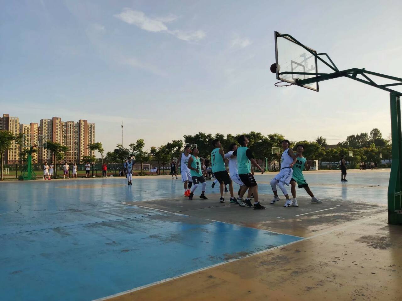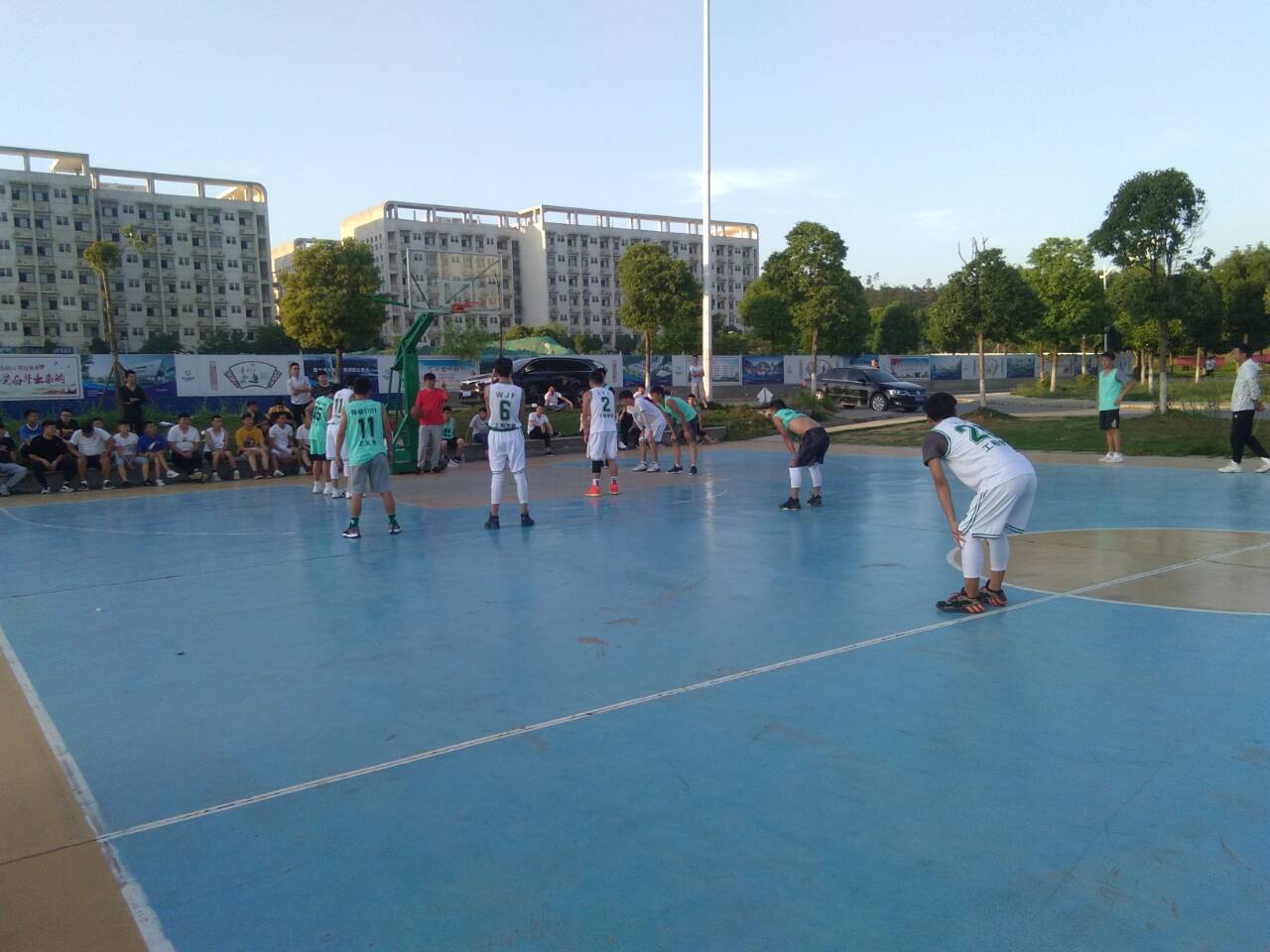 赛场上,双方比拼异常激烈,团队之间的默契传球、完美配合引来围观同学阵阵喝彩。比赛很快进入白热化阶段,赛场上战火燃烧,场下观众情绪激昂、奋力呐喊;赛场上球员们熟练地运球、传球,积极地拼抢、精准地投篮,场外的喝彩声也一浪高过一浪。
