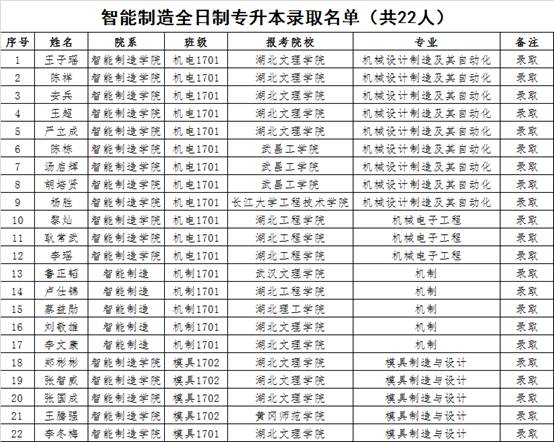 盛夏八月,硕果累累,在2020年湖北省普通专升本考试中,我校智能制造学院学子再获佳绩,共有22名同学分别被湖北文理学院、武昌工学院、长江大学工程技术学院、湖北工程学院、武汉文理学院、黄冈师范学院、湖北理工学院等七所本科学校录取。