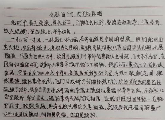 活动开始后,同学们积极响应,涌现出一大批佳作。同学们以细腻的笔触表达了个人对国家历史的认知与深厚的民族情怀,深情的描述革命烈士的英勇故事,传承并发扬优秀革命烈士的英雄气概,充分展现革命烈士的伟大精神。征文中这样写道“他们中有的千古留名,有的无人问津,他们都是为了一个共同的目标走到一起,那就是为了共产主义事业奋斗终身。为了革命,先辈们抛头颅,洒热血,前仆后继,在敌人面前宁死不屈,一身傲骨,表现了英雄的无畏气概。为我们后人树立了光辉的榜样”等等......这都是同学们的真情流露。