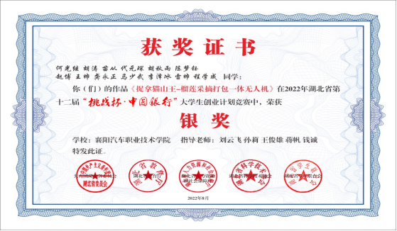 青春在实干中闪光、理想在奋斗中升华。 2022年7月,赵博受邀拍摄《一杯好茶》襄阳市茶文化推广及保康县扶贫文旅宣传片,担任主航拍手和航拍指导,为宣传片的制作提供了有力支持。他运用自己的专业技能和创新思维,将无人机的应用方式与茶文化相结合,生动形象地展示了茶文化的内涵和魅力,让人们对茶文化有了更深刻的认识和体验。同年8月,赵博的作品《捉拿猫山王-榴莲采摘打包一体无人机》在2022年湖北省第十二届“挑战杯·中国银行” 大学生创业计划竞赛中荣获银奖,充分展现了他的匠心精神。这个作品不仅将无人机技术与榴莲采摘相结合,还实现了一体化自动化的采摘和打包,大大提高了榴莲采摘的效率和品质,传递出了无人机在农业领域的强大应用价值。