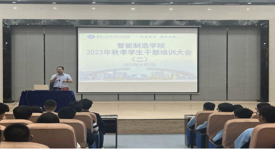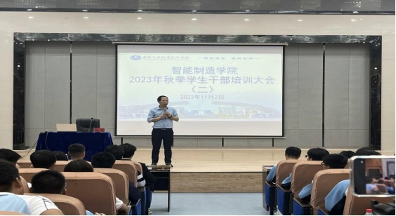 为建设一支业务精湛、作风优良的学生干部队伍,进一步提高学生干部的整体素质,更好的服务同学,2023年11月2日晚七点,智能制造学院在一号教学楼报告厅开展第二次“秋季学生干部培训”讲座,由学工处处长何峰主讲,智能制造学院党总支书记张军建主持,各班团支书、班长及学生会成员参加培训。
