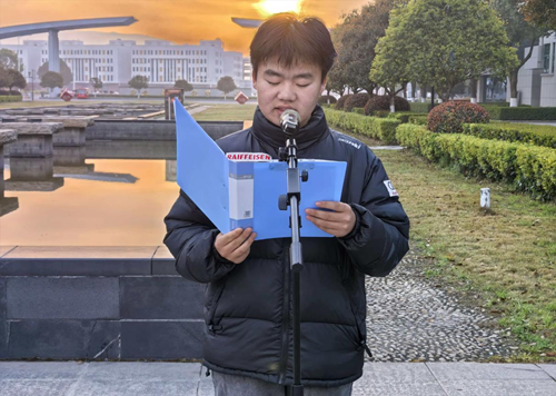 机电2506班李培森作为学生代表,围绕“青春自强,志在报国”这一主题展开阐述。他呼吁同学们将个人理想融入制造强国战略,以周恩来、钱学森为精神标杆,树立科技报国、技能强国的志向。他着重强调,真正的本领源自知行合一:在课堂上深入钻研机械原理与电路知识,课后攻克CAD绘图、编程与建模等难题,在实验中反复校准数据、提升精度。他讲到,课程设计中遇到的瓶颈是对思维的淬炼,实操过程中的失败是工艺的迭代,唯有具备雄鹰逆风飞翔的勇气、大国工匠千锤百炼的执着,才能在挫折中锻造坚韧的品格。